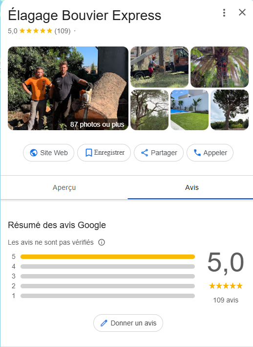 Avec 124 avis 5 étoiles sur Google, Bouvier Express est plébiscité pour son expertise en élagage et entretien paysager à Barjaquets, Rognac.